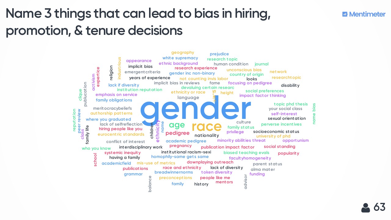 To help frame the discussion, attendees and Twitter users were asked to name three things that lead to bias in hiring, promotion, and tenure decisions. Gender and race were the two most prominent responses. A few additional themes materialized from clusters of similar responses, including having a family or the reputation of the institution where one works.