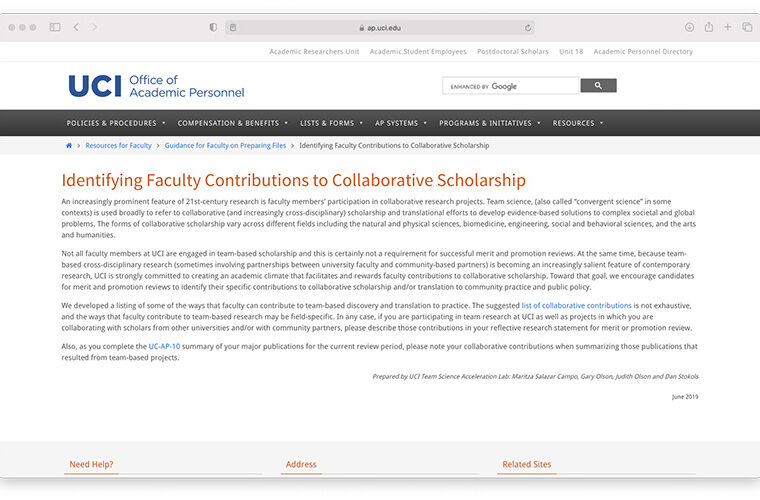The University of California, Irvine developed guidance “Identifying Faculty Contributions to Collaborative Scholarship” to help faculty describe and assess team science.