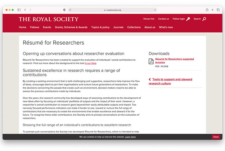 The Résumé for Researchers is a tool developed by the Royal Society to help support the evaluation and assessment of individuals’ varied research contributions.
